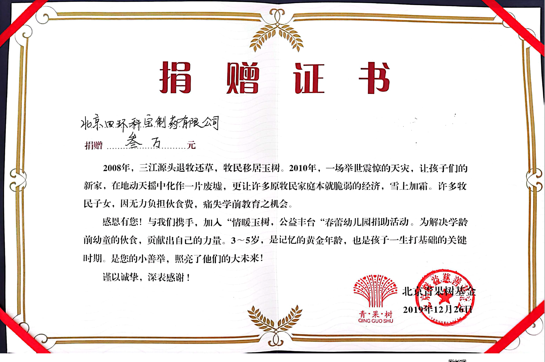 2019年12月,向玉树州儿童捐款3万元